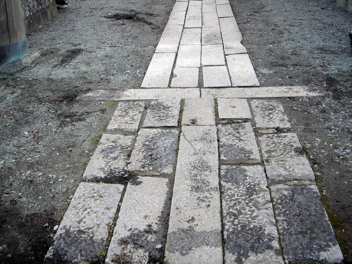 平成29年4月1日 現在 正面参道入口。 参道は歩道より一段下がっております。 正面参道入口(拡大) かなり歪んでおります。 平成29年4月3日 現在 参道入口より順番に作業が進んでおります。 平成29年4月6日 現在 かなり敷き直しが進んでおります。 近くで撮影。